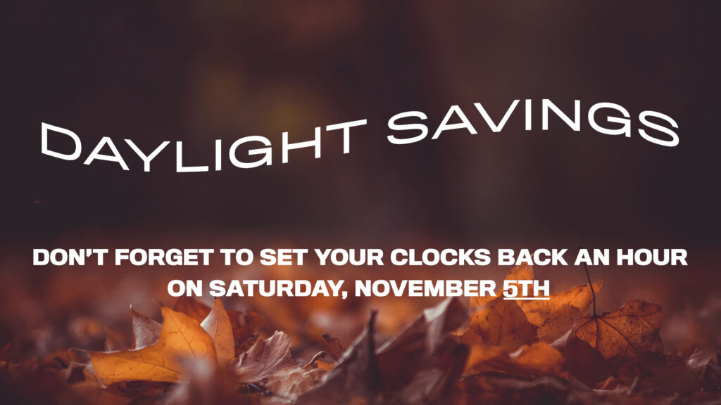 Daylight Saving Time ends on Sunday, November 6th. Don’t forget to set your clocks back one hour on Saturday, November 5th.