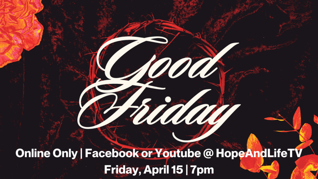Good Friday commemorates the crucifixion of Jesus and His death at Calvary and the sacrifice He made for us. Join us ONLINE for a special time of reflection and a timely word from our Pastors on Friday, April 15th at 7pm on either www.Facebook.com/hopeandlifetv or www.YouTube.com/hopeandlifetv.